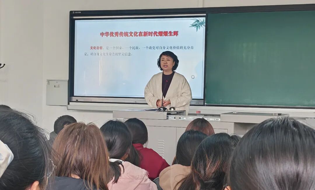随后,宋丽萍围绕文化自信主题,从“中华优秀传统文化在新时代熠熠生辉”“红色文化在新时代大放光芒”“社会主义先进文化让我们自信”三个维度展开,系统阐释了文化自信作为民族复兴深层力量的重大意义。她特别强调我们要保护好、传承好中华优秀传统文化,更要积极推动其创造性转化、创新性发展。
